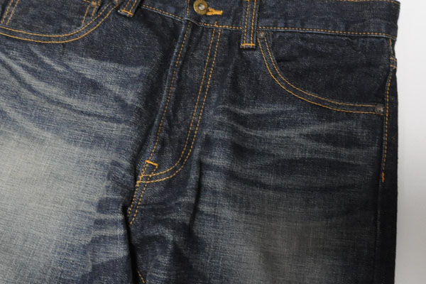 シルエットは股上をやや浅めで、ワタリ部分から裾にかけてのテーパードを強めにかけておりますので細身の綺麗なシルエットかつ、キャリーから出ているデニムで最も細いシルエットとなります。