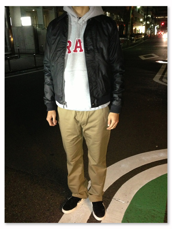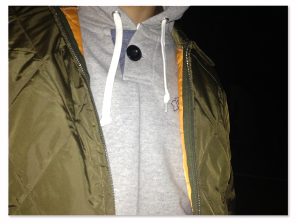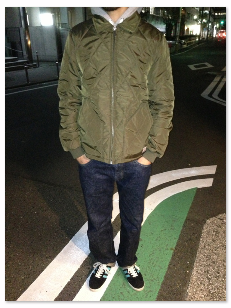 グレイのパーカーとデニムにオリーブのナイロンキルティングが調子が良いです。 袖がリブで裏地がオレンジで気分はMA-1って感じがどことなくミリタリーな雰囲気も味わえるワーク系のジャケットのような気がします。ちなみ178の65でMを着ているのですがSでもMでも良さそうでした。上のジャケットのnomadはSを着てます。