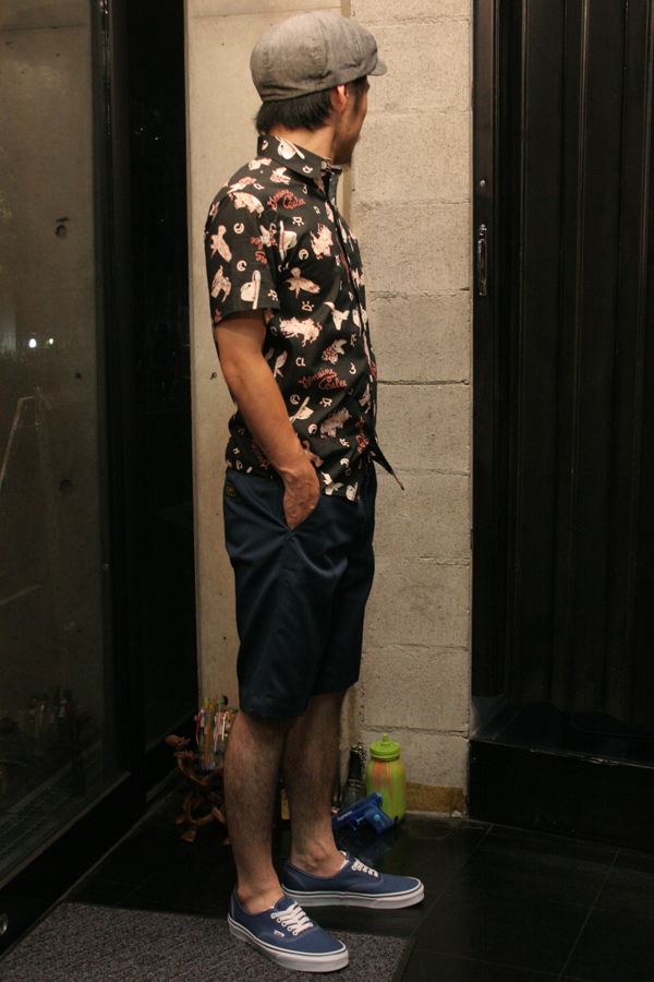 Tシャツにショーツ、ブラックxベージュのシンプルなスタイルですが赤や青がポイントで入ってるのが何気ないけど良いと思います。